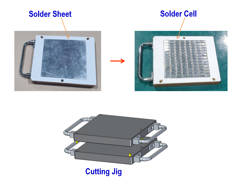 장비설명 Solder sheet를 프레스 금형의 칼날에 의해 Cell 형태의 Solder size로 동시에 커팅하는 장치