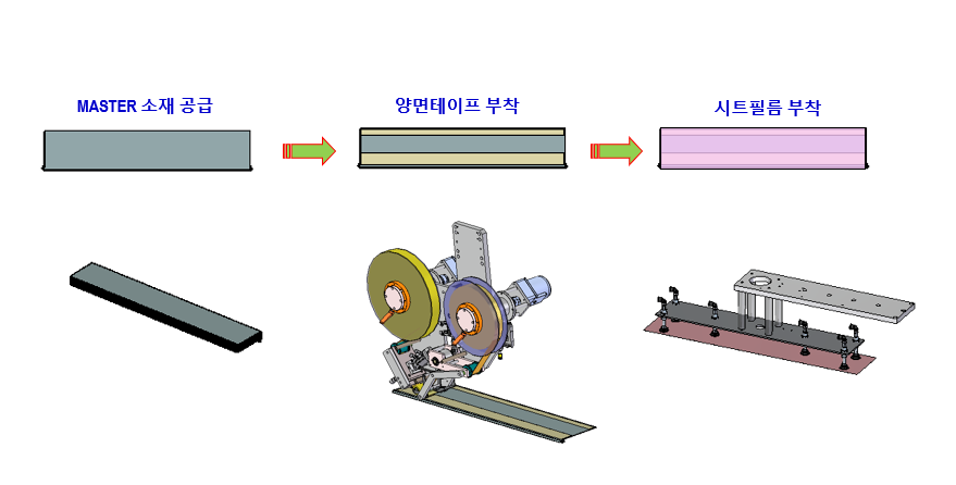 적용제품 Sheet제품에 양면 테이프 자동 부착 후에 이형 필름 부착하는 부품 류