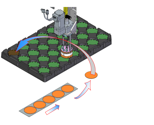 장비설명 PCB 등의 기판에 절연 Pad등을 비전으로 위치와 방향을 검출하여 위치를 보정하여 부착하는 장비
